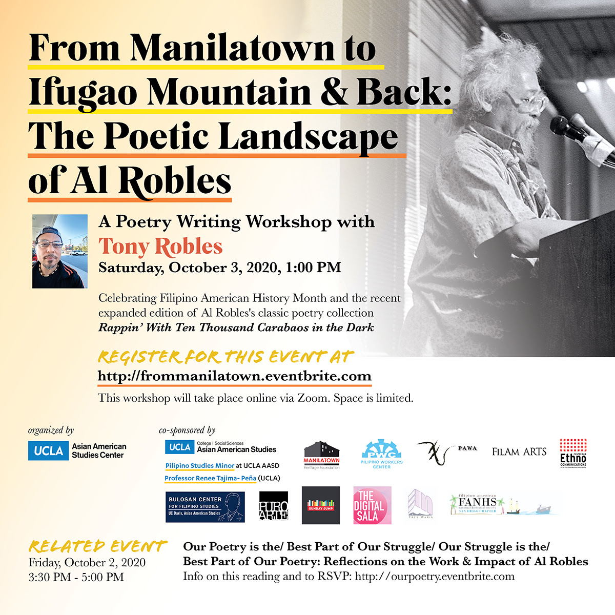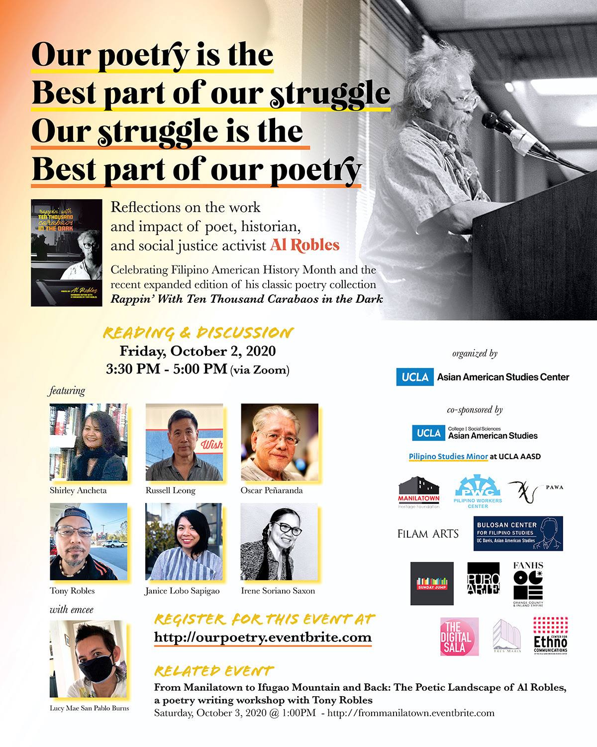 Friday, October 2, 3:30pm - 5:00pm Join us for a special online program that will remember Filipino American poet Al Robles, whose writing and activism reflected his deep commitment to community, especially through his documenting the stories of Filipino manongs and participating in the struggles for the International Hotel (I-Hotel) in San Francisco and housing justice for low-income residents. This event is in celebration of Filipino American History Month and the recent expanded edition of his classic poetry collection Rappin' With Ten Thousand Carabaos in the Dark (UCLA AASC Press). Register for the reading & discussion: http://ourpoetry.eventbrite.com. |