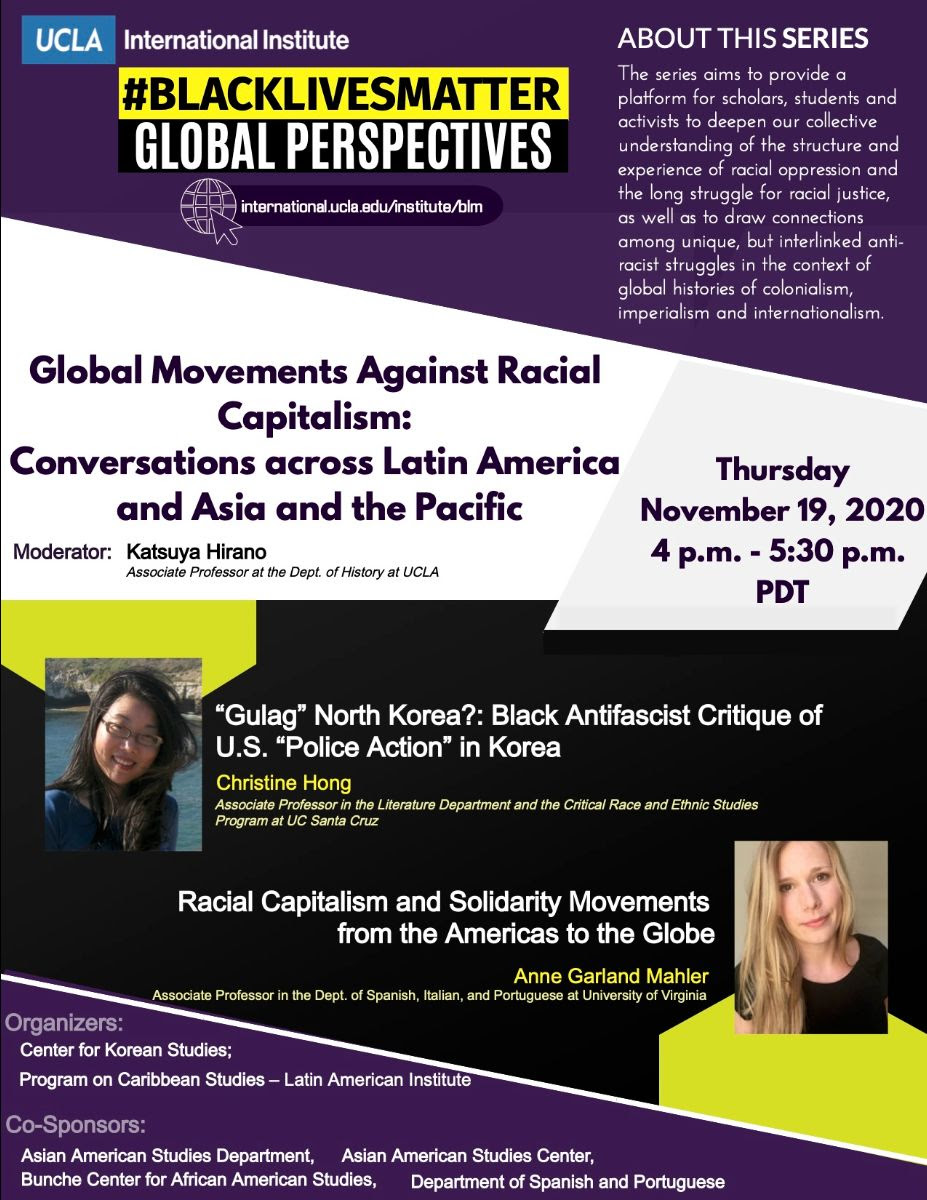 Thursday, November 19, 4:00pm - 5:30pm Via Zoom: Webinar Link How are struggles against anti-black racism in the United States connected to a longer history of global movements against racial capitalism? This event features two distinguished scholars who will discuss the stakes of transnational solidarity politics for racial and decolonial liberation in Latin America and across Asia and the Pacific. Their talks highlight the origins and the need to internationalize the fight against racism in the context of Cold War militarism and US empire-building abroad as well as grassroots struggles for racial justice at home. They also highlight the rich political traditions and histories of radical Black artists and intellectuals in engaging with and advancing emancipatory movements against racial capitalism around the world. Featured Speakers: