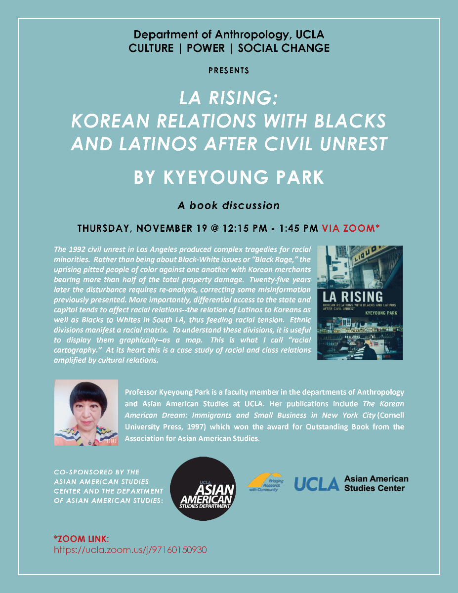 Thursday, November 19, 12:15pm - 1:45pm Via Zoom: Webinar Link In LA Rising: Korean Relations with Blacks and Latinos after Civil Unrest, Kyeyoung Park revisits the Los Angeles unrest of 1992 and the interethnic and racial tensions that emerged. The 1992 civil unrest in Los Angeles produced complex tragedies for racial minorities. Rather than being about Black-White issues or "Black Rage," the uprising pitted people of color against one another with Korean merchants bearing more than half of the total property damage. Twenty-five years later the disturbance requires re-analysis, correcting some misinformation previously presented. More importantly, differential access to the state and capital tends to affect racial relations--the relation of Latinos to Koreans as well as Blacks to Whites in South LA, thus feeding racial tension. Ethnic divisions manifest a racial matrix. To understand these divisions, it is useful to display them graphically--as a map. This is what Park calls "racial cartography." At its heart this is a case study of racial and class relations amplified by cultural relations. Professor Kyeyoung Park is a faculty member in the departments of Anthropology and Asian American Studies at UCLA. Her publications include The Korean American Dream: Immigrants and Small Business in New York City (Cornell University Press, 1997) which won the award for Outstanding Book from the Association for Asian American Studies. |