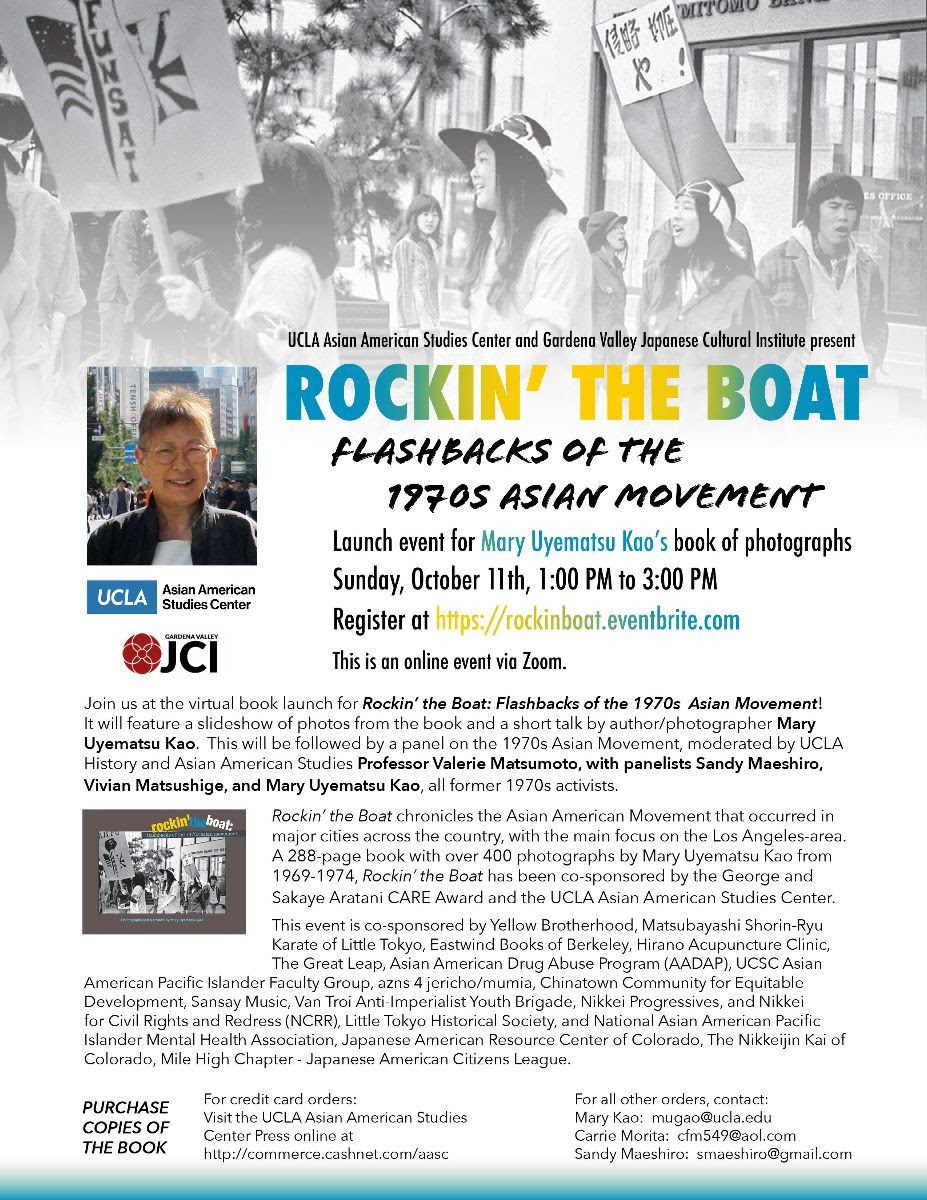 Sunday, October 11, 1:00pm - 3:00pm Via Zoom, Register for Link Join us at the virtual book launch of Rockin' the Boat: Flashbacks of the 1970's Asian Movement! It will feature a short slide show of photos from the book, a short talk by author/photographer Mary Uyematsu Kao, and a panel moderated by UCLA History and Asian American Studies Professor Valerie Matsumoto, with panelists Sandy Maeshiro, Vivian Matsushige, and Mary Uyematsu Kao, all former 1970's activists. Rockin' the Boat chronicles the Asian American Movement that occurred in major cities across the country, with the main focus on the Los Angeles-area. A 288-page book with over 400 photographs by Mary Uyematsu Kao from 1969-1974, Rockin' the Boat has been co-sponsored by the George and Sakaye Aratani CARE Award and the UCLA Asian American Studies Center. This event is co-sponsored by Yellow Brotherhood, Matsubayashi Shorin-Ryu Karate of Little Tokyo, Eastwind Books of Berkeley, Hirano Acupuncture Clinic, The Great Leap, Asian American Drug Abuse Program (AADAP), UCSC Asian American Pacific Islander Faculty Group, azns 4 jericho/mumia, Chinatown Community for Equitable Development, Sansay Music, Van Troi Anti-Imperialist Youth Brigade, Nikkei Progressives, and Nikkei for Civil Rights and Redress (NCRR), Little Tokyo Historical Society, and National Asian American Pacific Islander Mental Health Association, Japanese American Resource Center of Colorado, The Nikkeijin Kai of Colorado, Mile High Chapter - Japanese American Citizens League. |