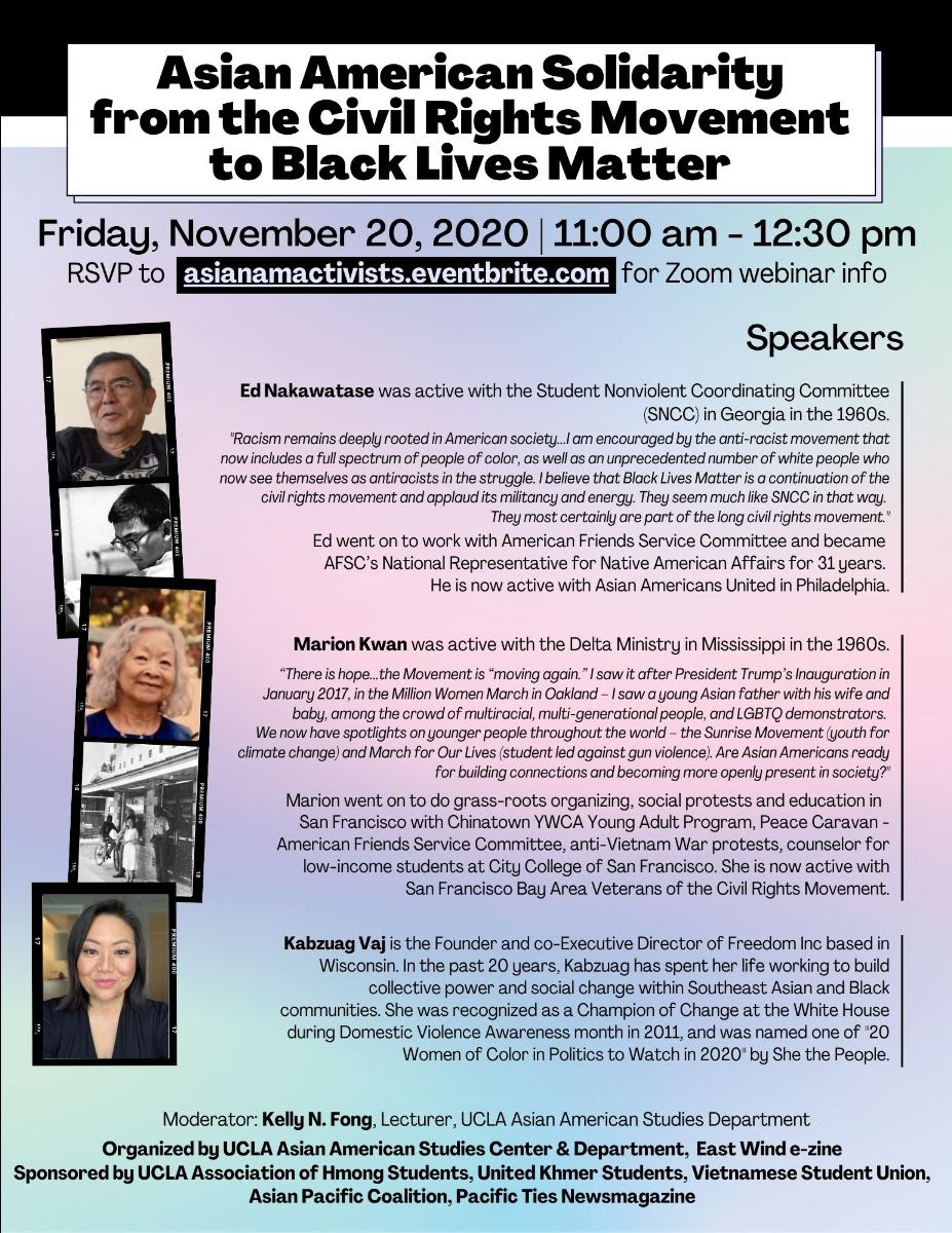 Friday, November 20, 11:00am - 12:30pm Via Zoom, Register for Link http://asianamactivists.eventbrite.com Join us for a special discussion on Asian American solidarity and social and activist movements with speakers Ed Nakawatase, Marion Kwan, and Kabzuag Vaj, and moderated with Kelly N. Fong. This event is co-organized by the UCLA Asian American Studies Center and Department and East Wind E-Zine. Ed Nakawatase was active with the Student Nonviolent Coordinating Committee (SNCC) in Georgia in the 1960s. Ed went on to work with American Friends Service Committee and became AFSC’s National Representative for Native American Affairs for 31 years. He is now active with Asian Americans United in Philadelphia. Marion Kwan was active with the Delta Ministry in Mississippi in the 1960s. Marion went on to do grass-roots organizing, social protests and education in San Francisco with Chinatown YWCA Young Adult Program, Peace Caravan - American Friends Service Committee, anti-Vietnam War protests, counselor for low-income students at City College of San Francisco. She is now active with San Francisco Bay Area Veterans of the Civil Rights Movement. Kabzuag Vaj is the Founder and co-Executive Director of Freedom Inc based in Wisconsin. In the past 20 years, Kabzuag has spent her life working to build collective power and social change within Southeast Asian and Black communities. She was recognized as a Champion of Change at the White House during Domestic Violence Awareness month in 2011, and was named one of "20 Women of Color in Politics to Watch in 2020" by She the People. Supported by UCLA Association of Hmong Students, United Khmer Students, Vietnamese Student Union, Asian Pacific Coalition, Pacific Ties Newsmagazine. |