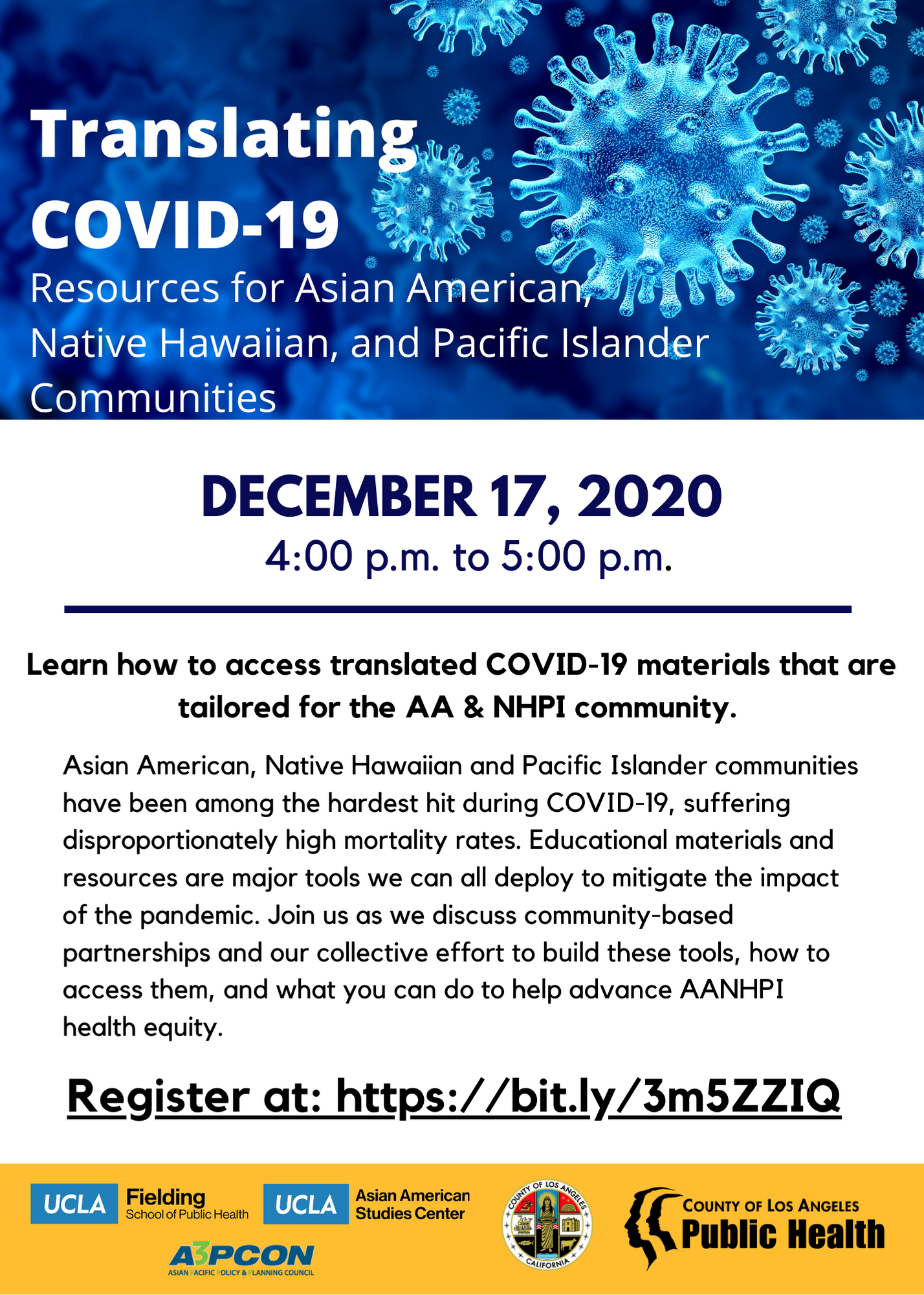 Friday, November 13, 1:00pm - 2:30pm Online, Register for Link Join us for a special online discussion, "Pandemics and Vulnerable Communities," that will focus on the impact of this current crisis. It will feature AASC Faculty Advisory Committee (FAC) member Professor Ninez Ponce (UCLA Fielding School of Public Health), Professor Don Operario (Brown University), and RJ Taggueg (Bulosan Center for Filipnx Studies), with AASC FAC Chair Professor Gilbert Gee (UCLA Fielding School of Public Health) moderating. Register and find out more here. |